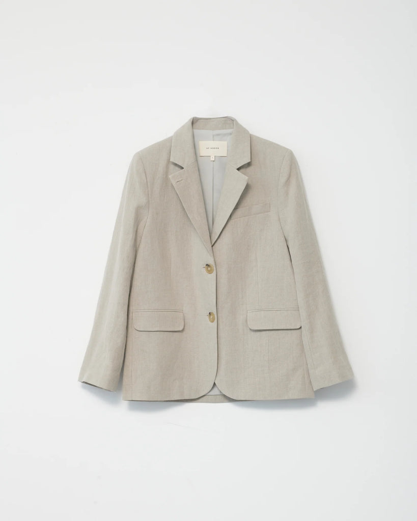 Hørblazer med en let oversized pasform. Med lukning med hornknapper, 2 i midten og 1 lukning i halsen. Lange lige ærmer, to lommer foran og naturfor.