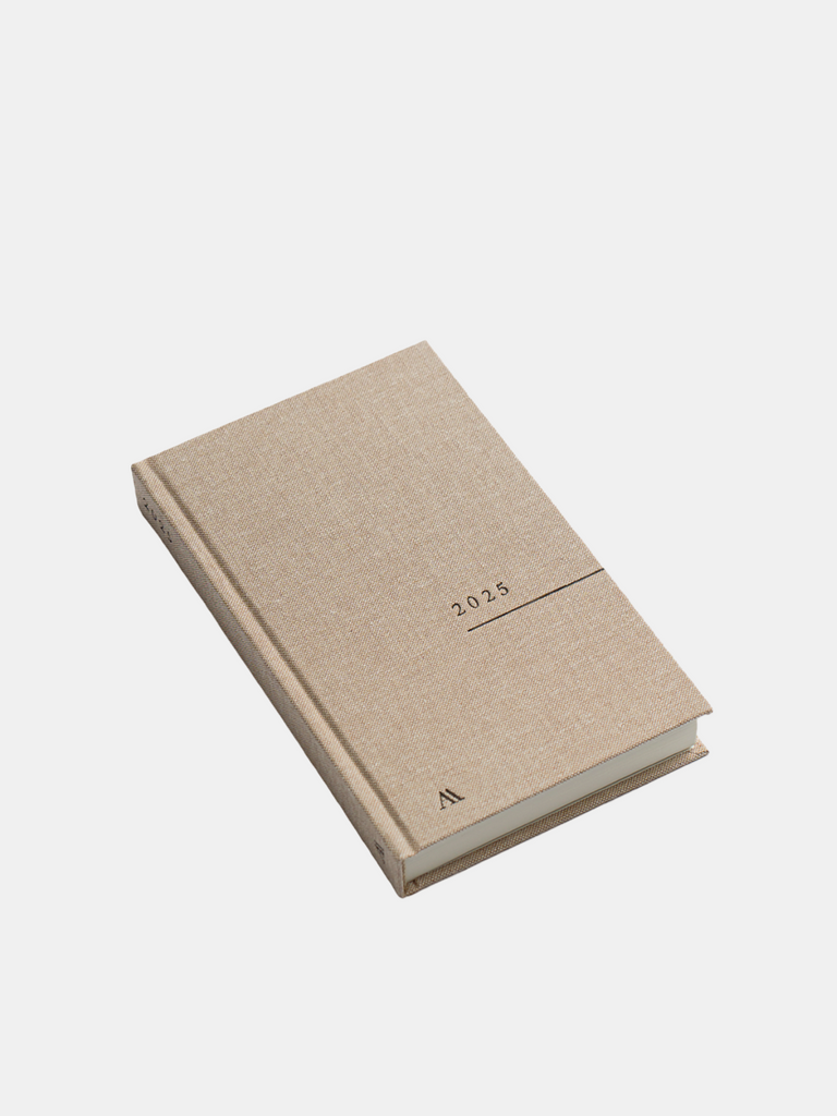 Dagskalenderen dækker januar - december 2025 med én dag pr. side (fælles side til weekender) og har plads til månedens drømme, intentioner samt daglige huskelister.