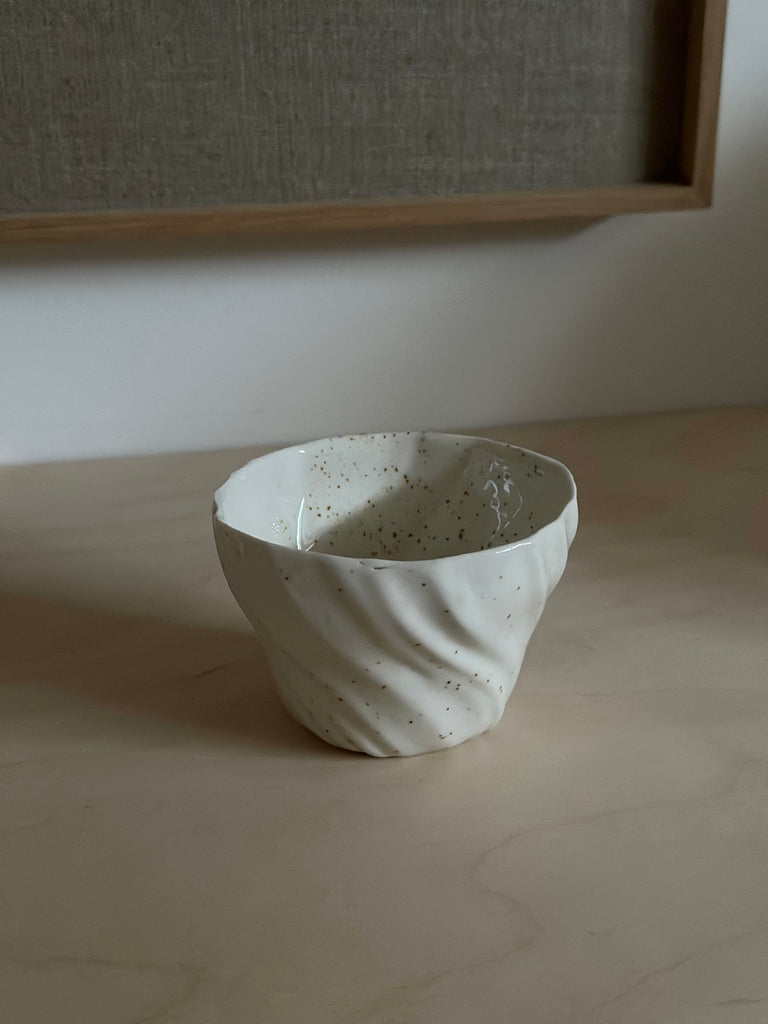 Koppen er håndlavet i Århus i det fineste hvide porcelænsler. Den tåler opvaskemaskine og passer perfekt i størrelsen ind i din kop-reol.