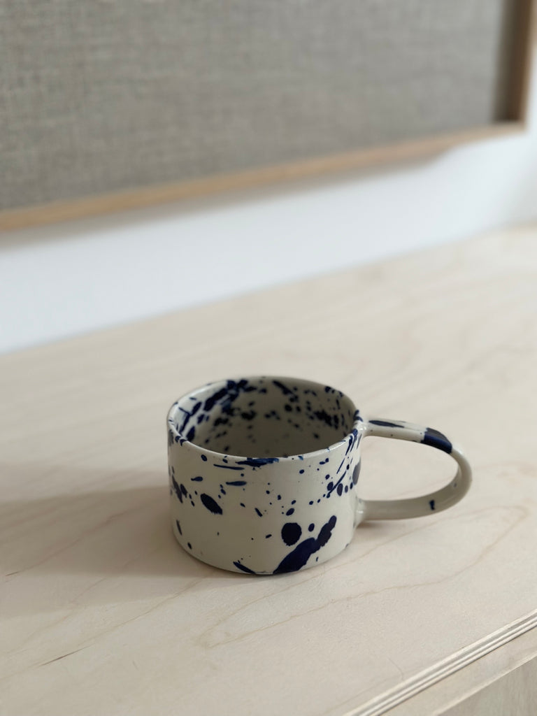 Blue Ink Clear Glossy koppen har en blank, glat overflade. De blå pletter er sprøjtet på i hånden, og glaseret med en transparent glasur.