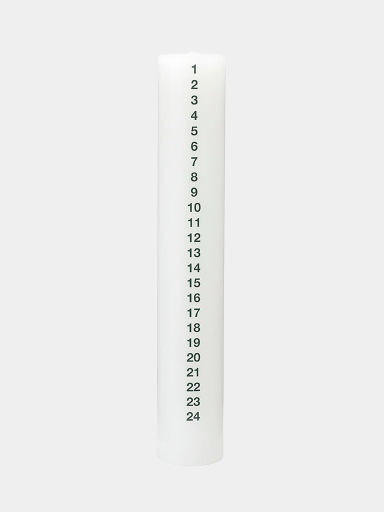 Fint stort kalenderlys fra Kunstindustrien med grønne tal, der tæller alle dage fra 1 - 24.  Lyset er 6 cm i diameter og 40 cm højt og har 150 brændetimer.