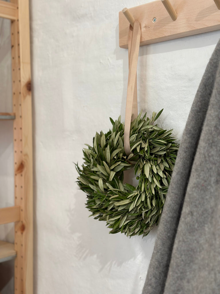 Skønneste friske olivenkranse, der både kan hænge på døren eller lægges omkring et lys…
