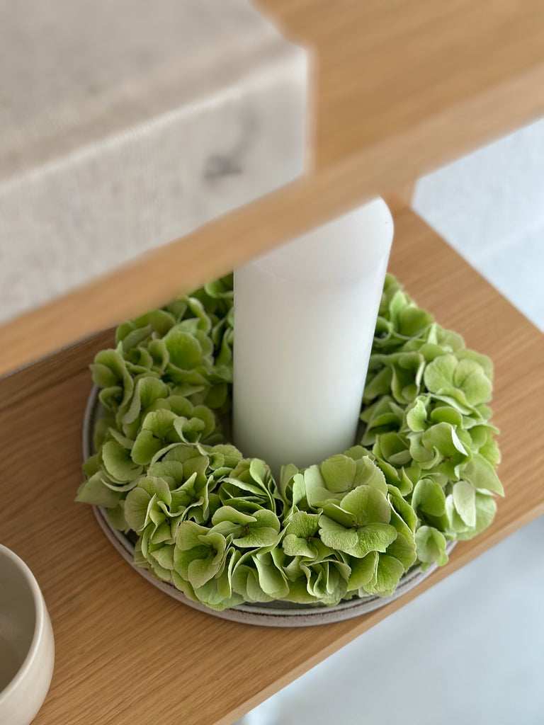Vivis fine håndlavede Hortensiakranse, som vi elsker i et fad omkring et lys, eller med et bånd på døren.