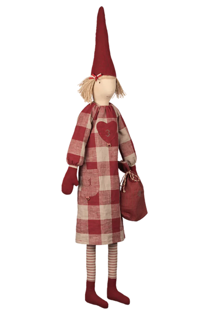 December er fuld af familietraditioner, og denne kalendernisse kan blive din næste. Adventskalenderen har 4 ringe/lommer til de små overraskelser - en til hver af de 4 sidste søndage før jul. Den har en strop i nakken, så den er nem at hænge op.