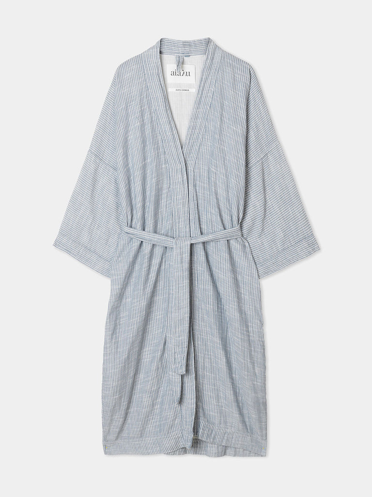 Den klassiske badekåbe med striber er normal i størrelsen, men på grund af snittet og den justérbare pasform kan man med fordel gå en størrelse op.