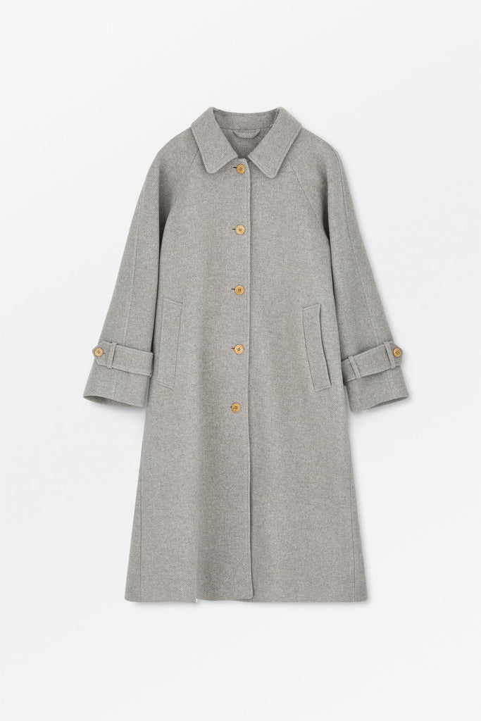 Macy Coat er en klassisk frakke i eksklusiv, genanvendt uld. Den har rund hals med krave og lukkes med synlige knapper. Frakken har to skrå lommer foran og en slids bagpå. Den har desuden raglanærmer med regulérbare stropper.