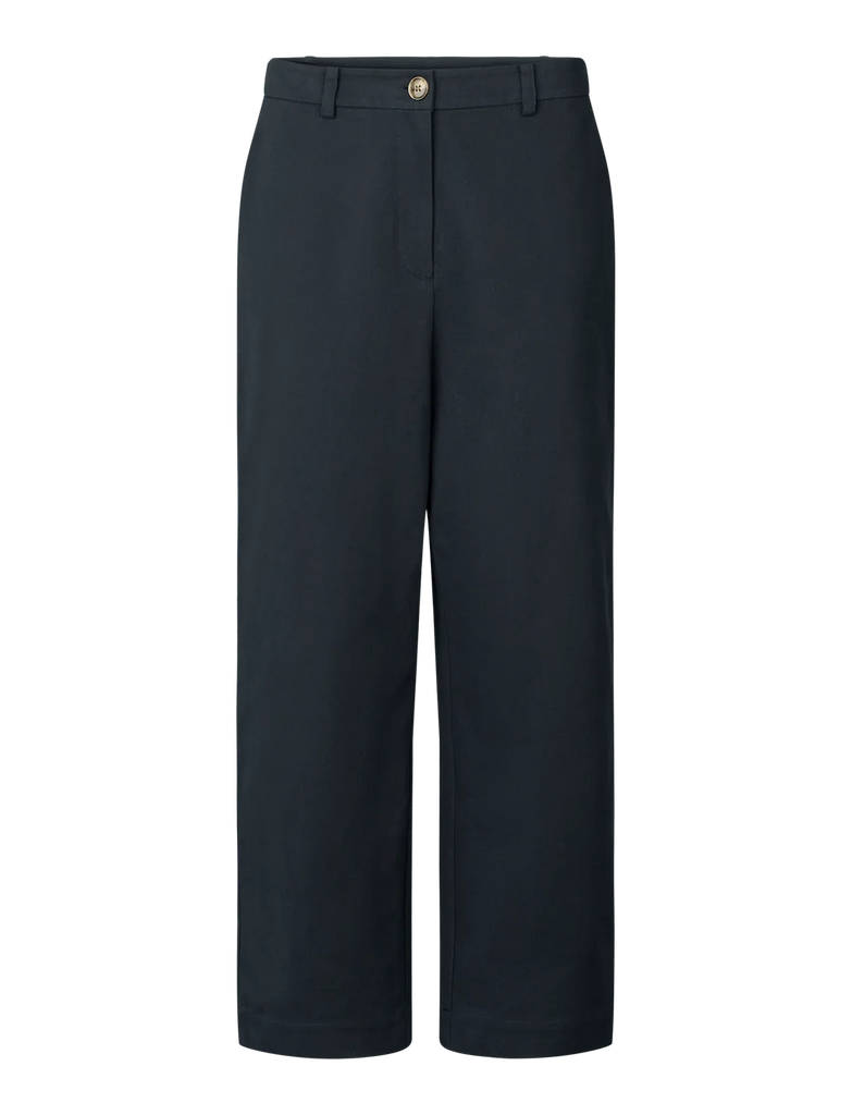 Skønne bløde bomuldsbukser med et klassisk udtryk i en vævet twill. Vide lige ben og fast lining med en enkelt knaplukning og bæltestropper. Brug dem med en striktrøje først i sæsonen og senere med en lille top eller skjorte og sandaler.