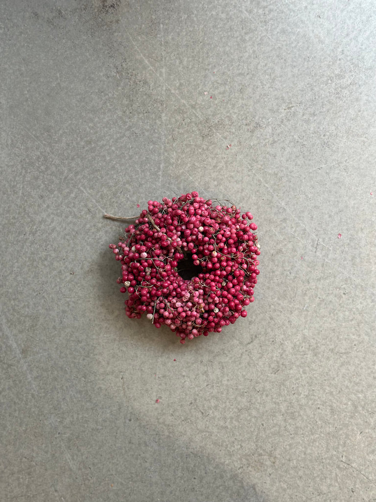 Fineste krans lavet af rød peberkorn. Kransen er tørret og skal fortsat bare ligge og tørre.