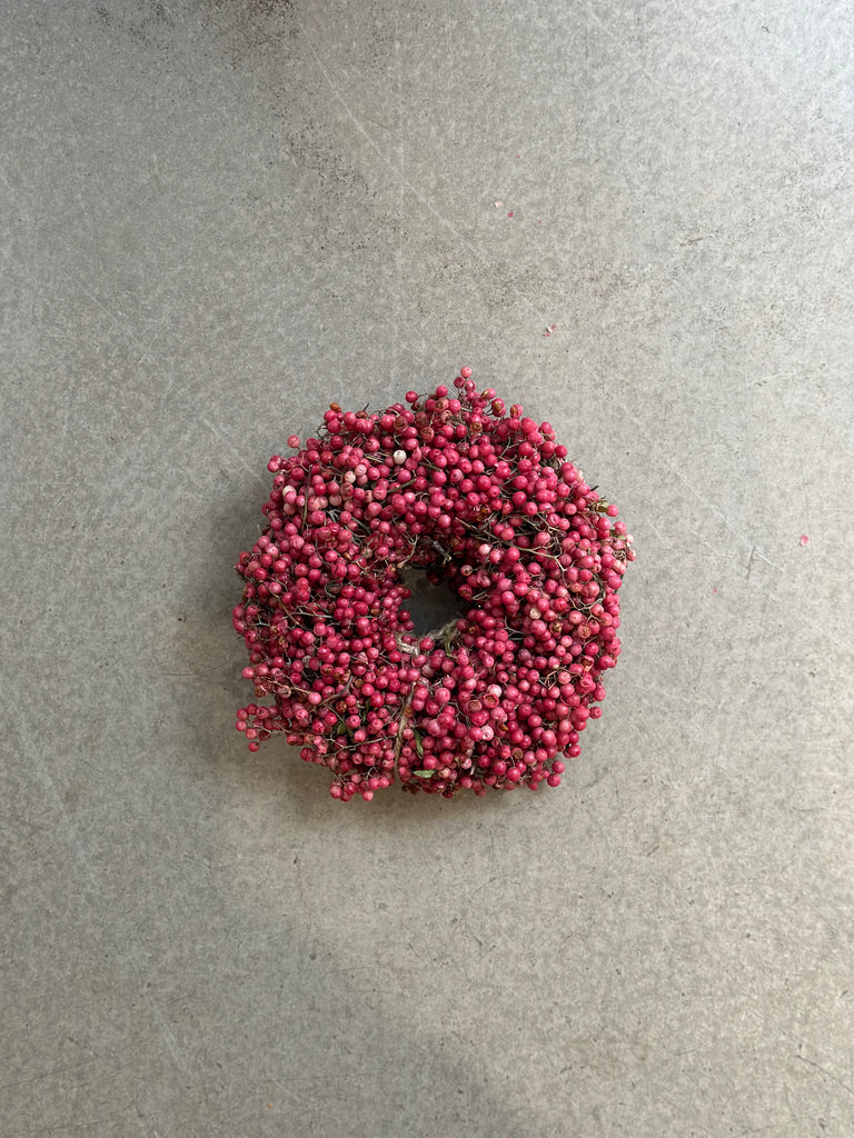 Fineste krans lavet af rød peberkorn. Kransen er tørret og skal fortsat bare ligge og tørre.