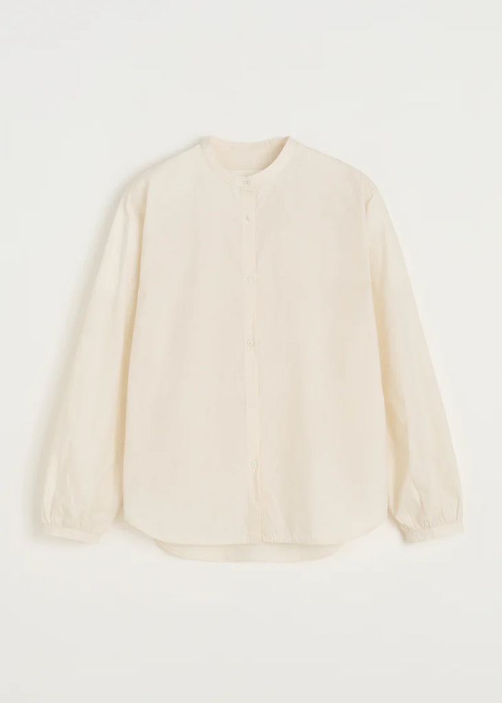 En feminin, kraveløs skjorte fremstillet af blød, økologisk bomuldspoplin. Designet i en regulær pasform med delikate perlemorsknapper, kurvet kantlinje og dekorative rynkedetaljer ved bærestykket og ærmerne, der skaber en elegant, voluminøs silhuet.