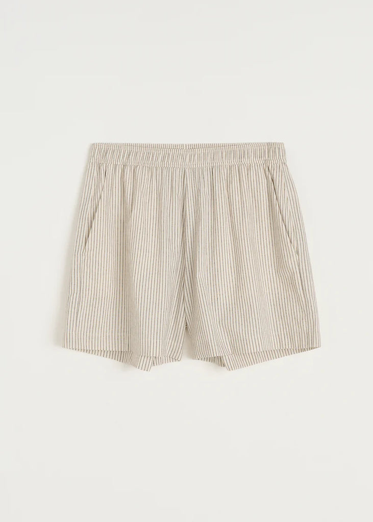 Et par casual shorts fremstillet i blød, ufarvet økologisk bomuld og vævet med kontrastfarvede striber. Shortsene er designet i enoversized pasform med en elegant, svajende effekt og et bredt, elastisk bindebånd i taljen.