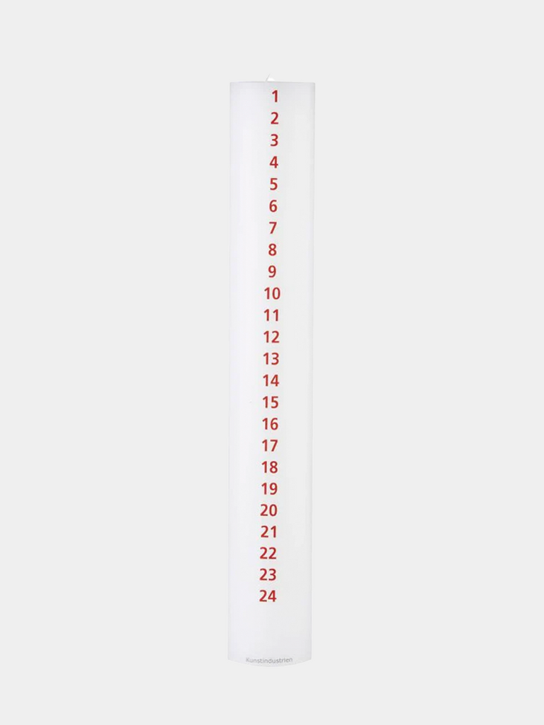 Fint stort kalenderlys fra Kunstindustrien med røde tal, der tæller alle dage fra 1 - 24.  Lyset er 6 cm i diameter og 40 cm højt og har 150 brændetimer.