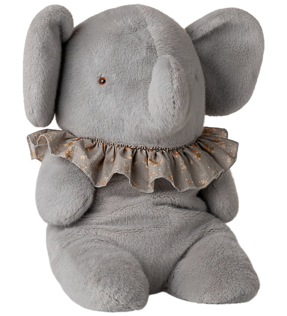Charmerende Maileg bamse med form som en elefant i blødt, gråblå plys. Bamsen har en fin krave med blomsterprint omkring halsen. Maileg bamsen udstråler tryghed og er en sød tilføjelse til børneværelset.