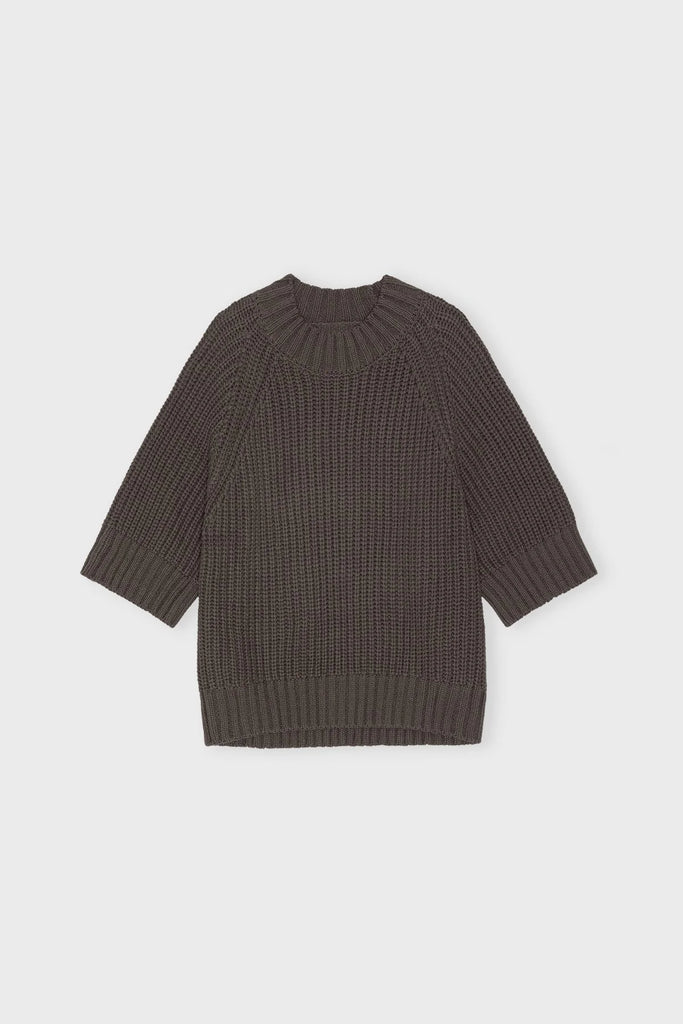 Brun, chunky strik med rund hals og voluminøse, trekvart-længde ærmer. Sweateren har dekorative, grove ribkanter som omslutter hver manchet og søm.